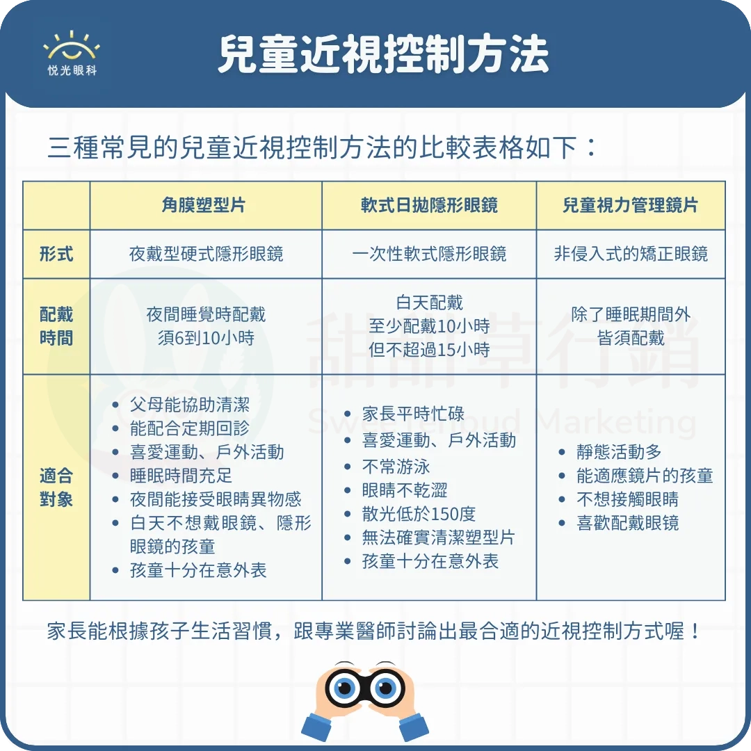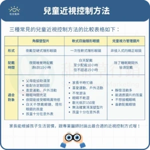- 透過結構化表格,橫向評估「角膜塑型片」、「軟式日拋」與「兒童視力管理鏡片」的配戴時長與適合對象,讓家長能快速與醫師討論最合適的方案 。