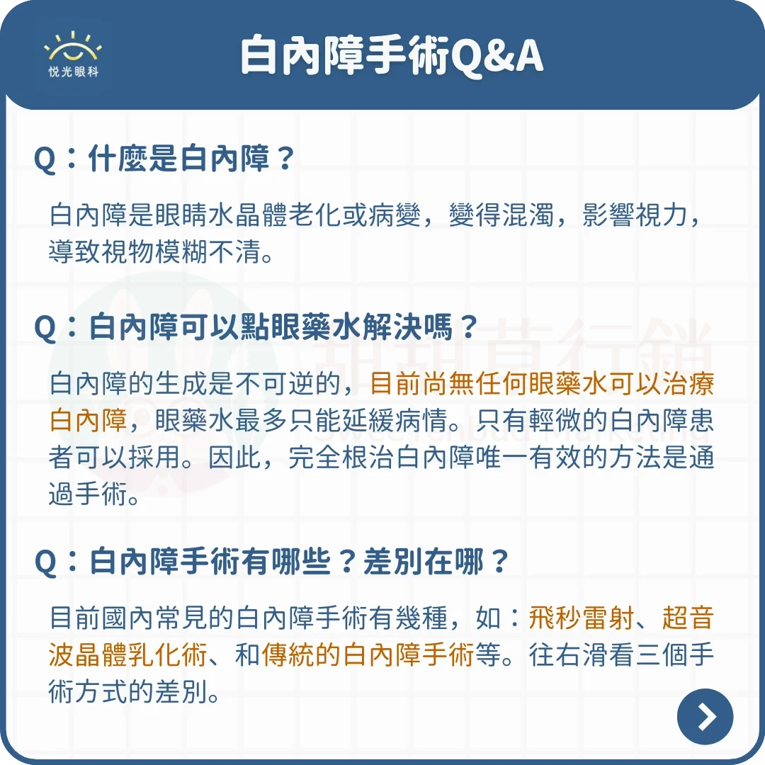 - 直擊「點藥水能否治癒」的常見迷思,明確指出手術是唯一根治方法,建立正確衛教觀念 。