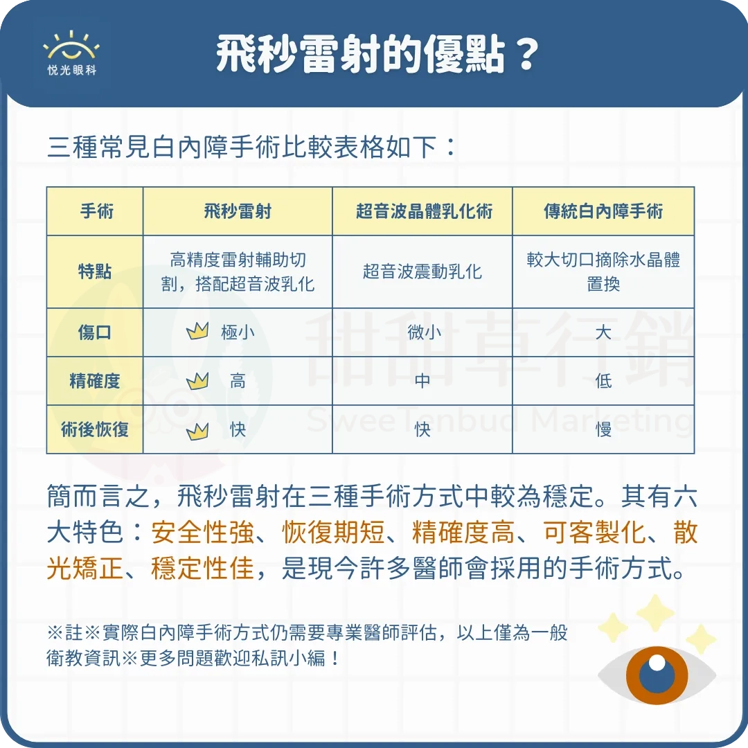 - 將高端醫療技術「飛秒雷射」優勢拆解為六大特色(高精確度、短恢復期等),並與傳統手術進行效能對比,降低病患對手術的恐懼感 。